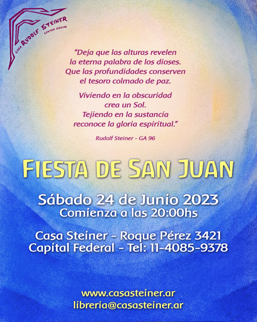 Este sábado 24 de Junio a las 20 hs celebramos La Fiesta de San Juan en Casa Steiner, fiesta que aspira a que podamos oír esa voz que nos guía a encontrar la luz del mundo dentro de su oscuridad, aquello que es el nacimiento de lo eterno en el ser humano.